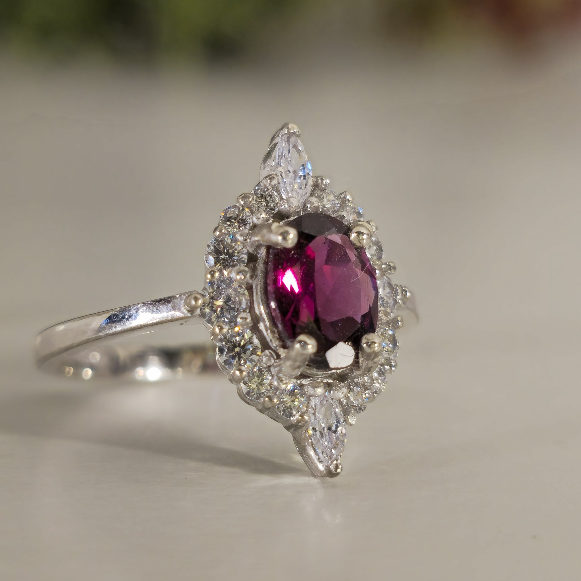 Este anillo está elaborado en plata .925 con baño de rodio, con una Rhodolita Natural al centro, rodeada por un halo brillante de zirconias que realzan su color y aportan un toque de elegancia atemporal.