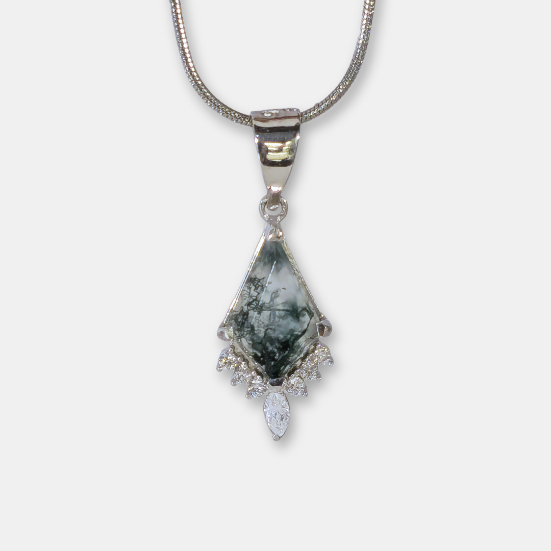 Elaborado en plata .925 con baño de rodio, este dije enmarca una ágata musgosa natural con vetas únicas que parecen pequeños paisajes dentro de la piedra.